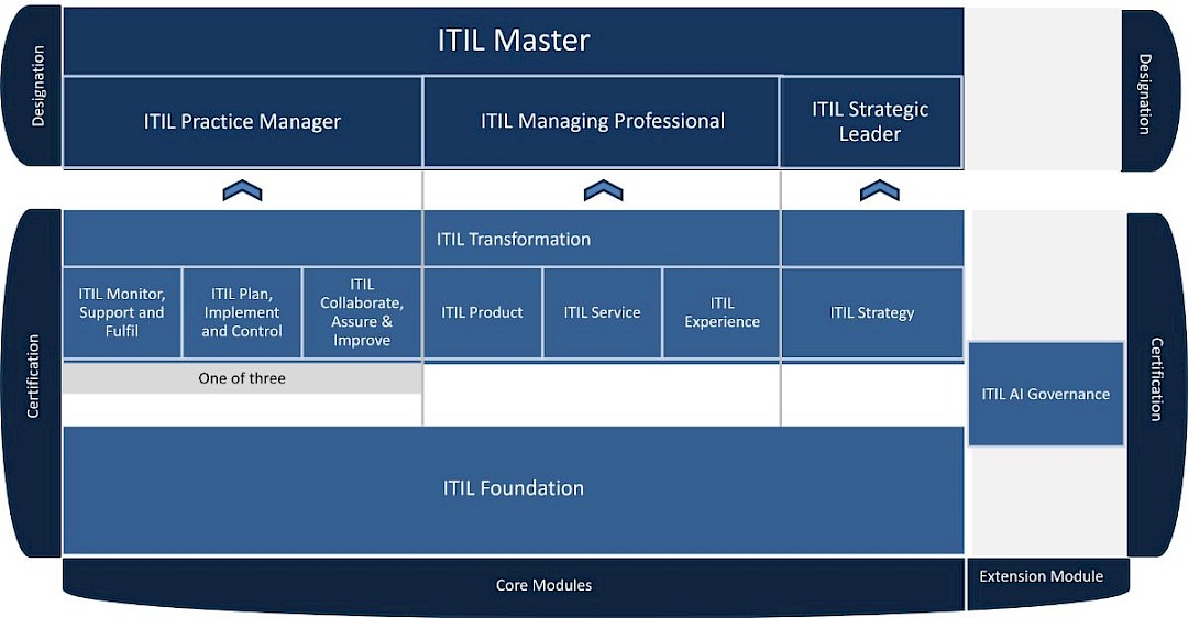 Achieving all three designations leads to the highest recognition: the ITIL Master. In total, ITIL (Version 5) offers four designations, each building toward holistic